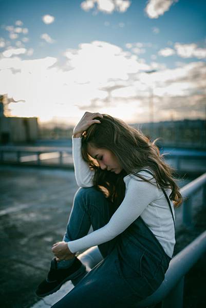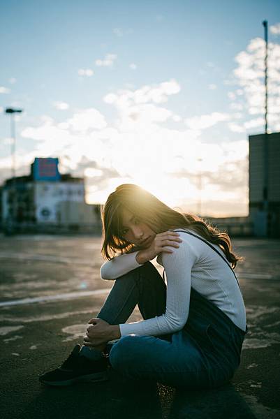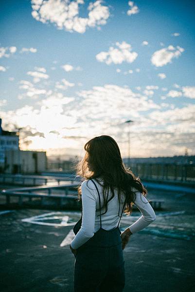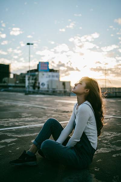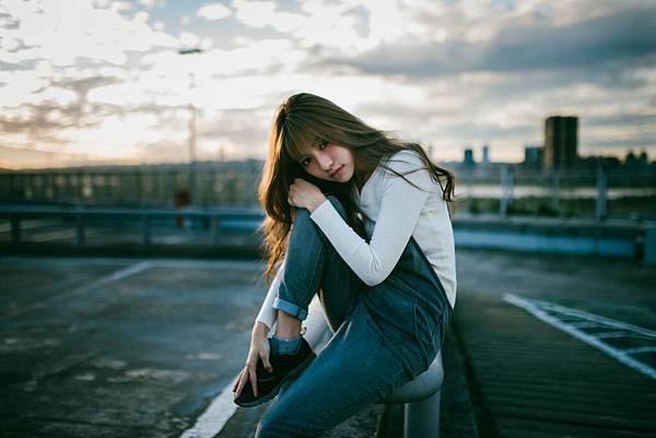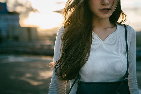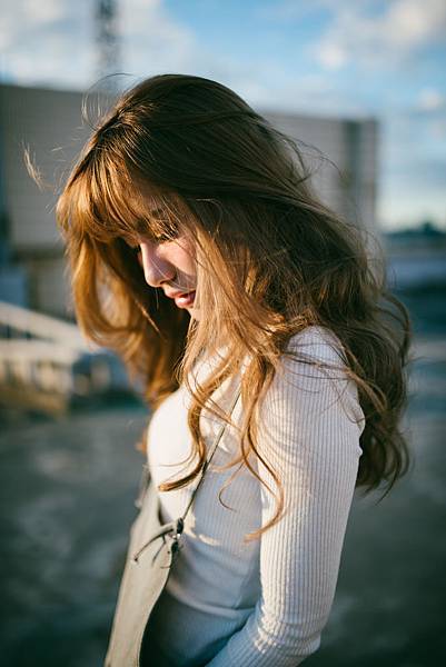 日落造成的黃色光線灑在模特兒的頭法上非常的美